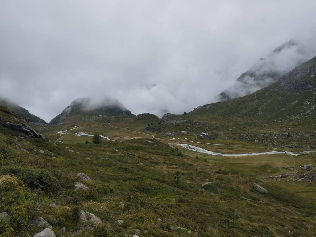 On range la tente sous un brouillard persistant, qui ne se lèvera pas de la journée. Dommage, car le chemin du jour semble magnifique, il faudra revenir un jour pour pouvoir mieux en profiter ! On dépasse les lacs de Tachuy dans une atmosphère presque mystique conférée par la brume. L’arrivée au col du Tachuy est étonnante : le brouillard est tellement épais qu’on peine à comprendre par où il faut passer. Il n’y aucun passage technique, mais on ne voit rien, il n’y pas de sentier, et on doit traverser des névés en suivant des cairns qu’on distingue à peine. Après un temps d’hésitation, on arrive à rejoindre le sentier qui descend rapidement vers le lac du Petit : nous voilà de retour en France. Sur la descente, on croise nos deux compères transalpistes. Ce seront les seules personnes de croisées aujourd’hui sur les sentiers.