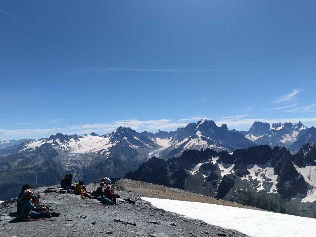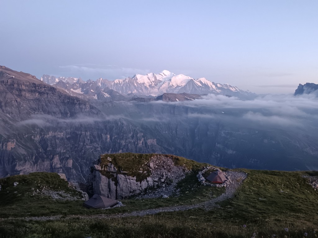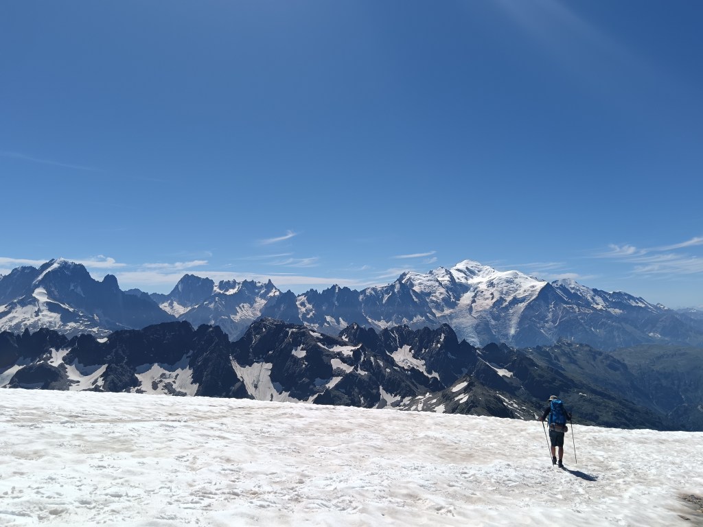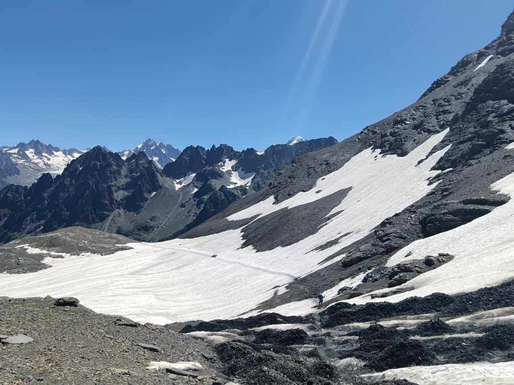 S’ensuit une descente parmi un champ de blocs pas trop abrupt, avant de retomber sur un sentier qui remonte en lacet vers le refuge Albert Deffeyes. La vue du refuge, sur le glacier du Ruitor et sur les sommets environnants est splendide. On installe la tente en contrebas du refuge, en face du glacier. Encore une fois la météo n’annonce rien de bon, mais pour le moment l’orage semble loin.