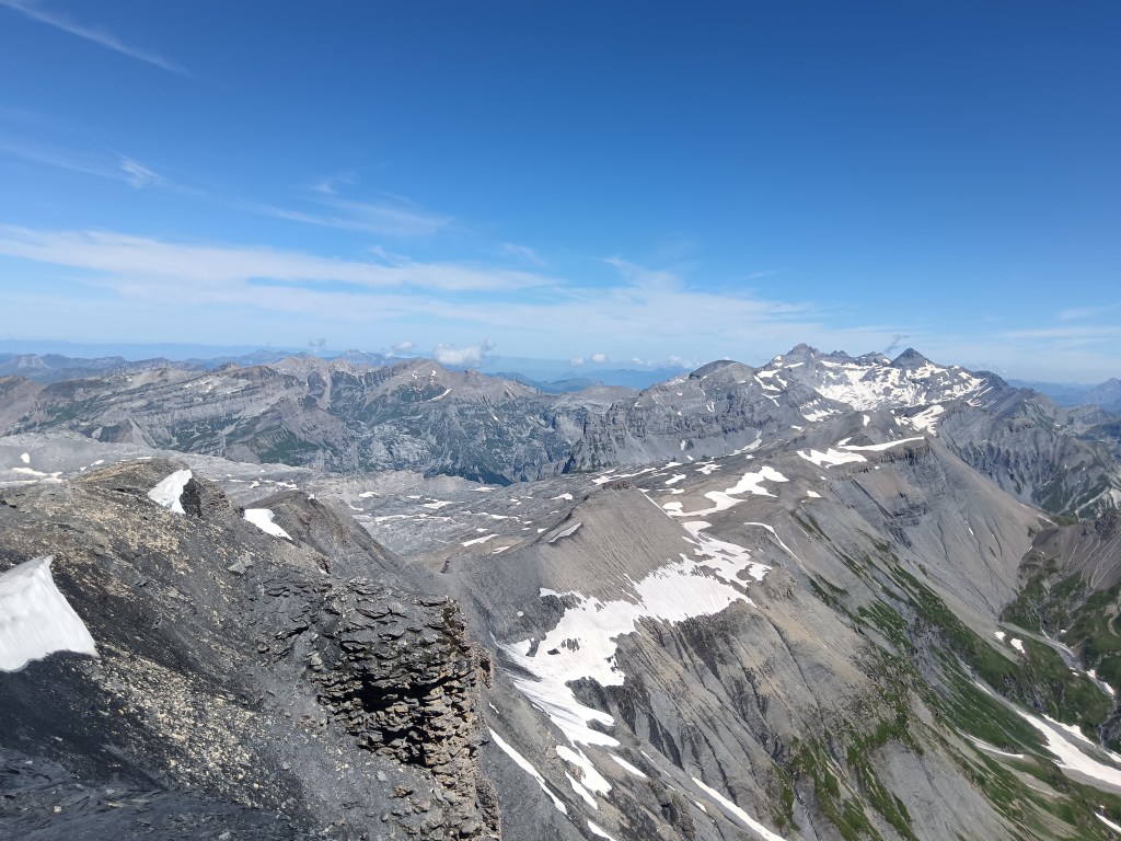 Un névé bien raide occupe le centre de la combe, nous le contournons tant que possible par la droite mais le terrain devient de plus en plus instable, les pierres n’arrêtent pas de nous rouler sous les pieds, on avance très mal. Warren fait une courte tentative de passer par le névé. Horreur, il commence à glisser un peu, mais heureusement reprend pieds côté terrain qui se casse la figure : on n’en mène pas large ! Pour éviter une glissade de 200 m vers des bonnes grosses pierres qui attendent sous le névé, on décide de s’en tenir aux éboulis et on atteint difficilement le col. Sur notre première partie de Transalpes (on va s’arrêter une semaine plus tard vers le Mont Cenis), ça restera le seul passage qui nous aura vraiment fait peur. On y est passés mi-août, et ce névé final était assez impressionnant !