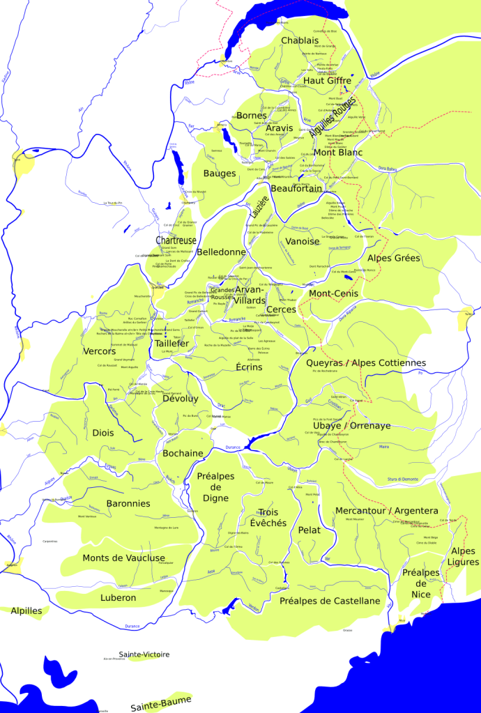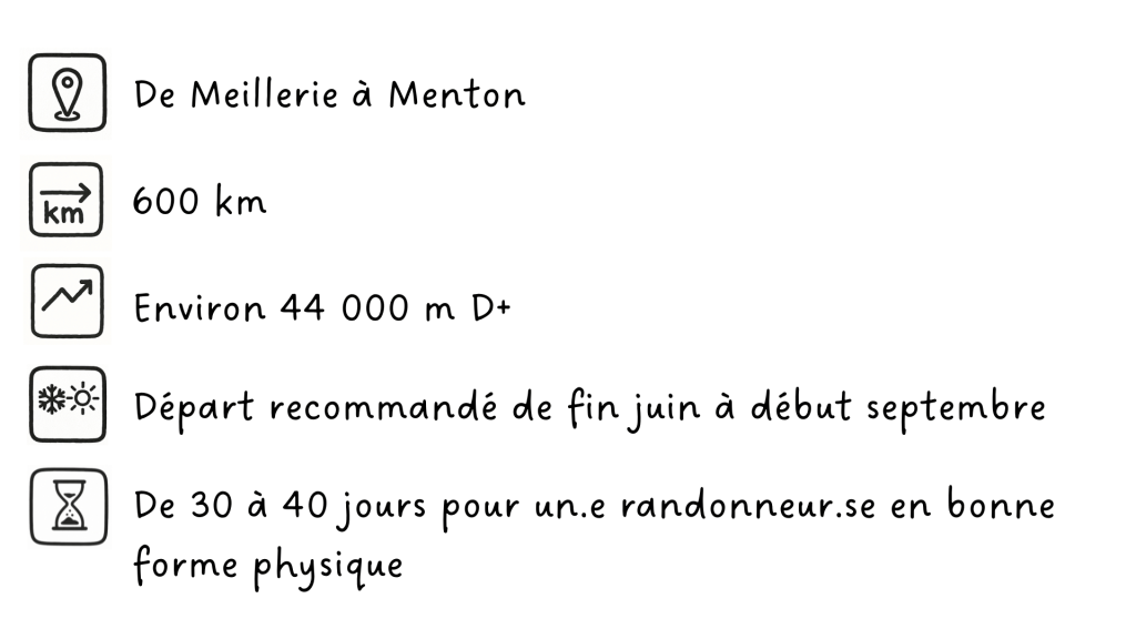 Je n’ai personnellement pas enregistré de traces pendant notre itinérance donc je n’ai pas nos chiffres précis, mais la traversée représente environ 600 km et autour de 44 000 mètres de dénivelé positif d’après le topo de Bonneaux. En tout, plus d’une dizaine de massifs sont traversés : le Chablais, le Haut Giffre, les Aiguilles Rouges, le Mont Blanc, la Haute Tarentaise, la Vanoise, le Val Troncea, le Queyras, l’Ubaye, le Mercantour Nord, l’Argentera, le Gélas et enfin le Mercantour Sud.
