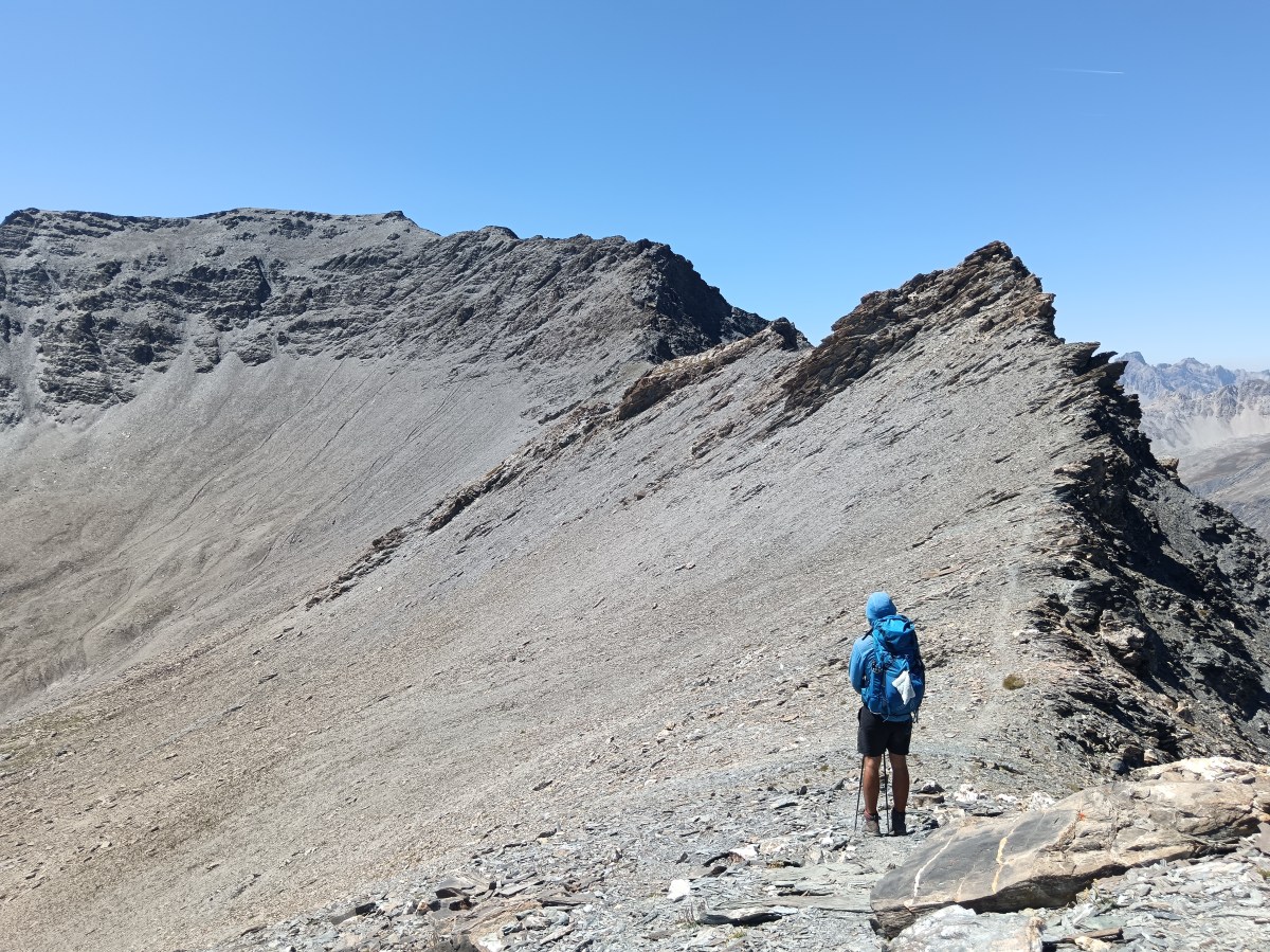 Je n’ai personnellement pas enregistré de traces pendant notre itinérance donc je n’ai pas nos chiffres précis, mais la traversée représente environ 600 km et autour de 44 000 mètres de dénivelé positif d’après le topo de Bonneaux. En tout, plus d’une dizaine de massifs sont traversés : le Chablais, le Haut Giffre, les Aiguilles Rouges, le Mont Blanc, la Haute Tarentaise, la Vanoise, le Val Troncea, le Queyras, l’Ubaye, le Mercantour Nord, l’Argentera, le Gélas et enfin le Mercantour Sud.